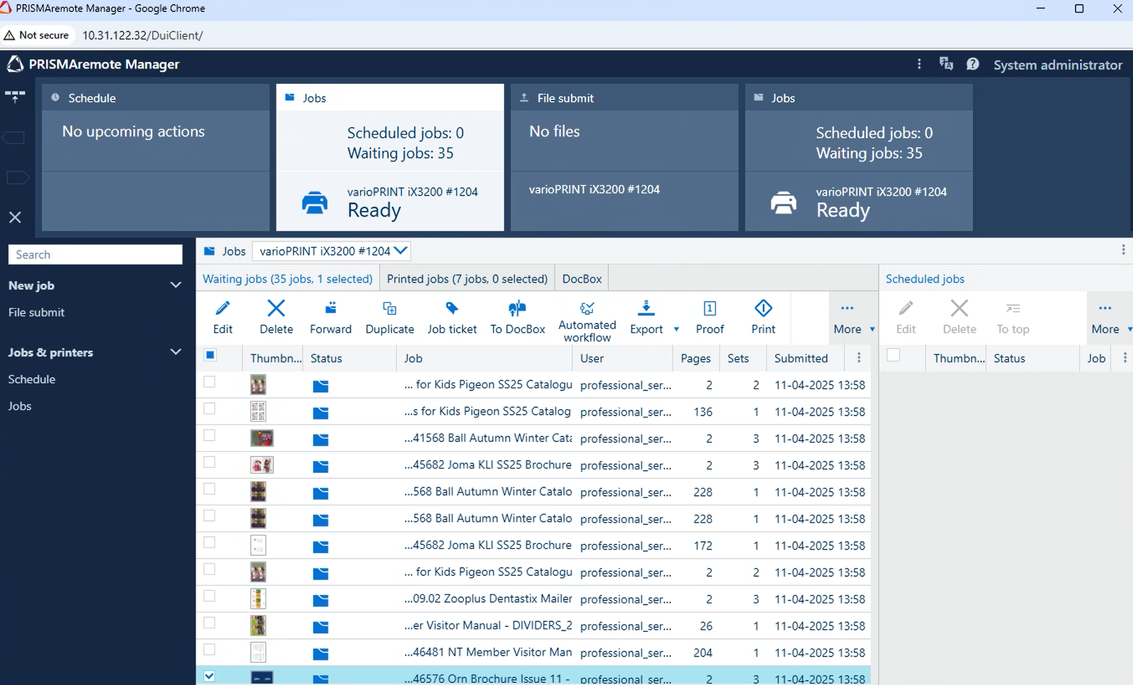 The operator interface provides a clear overview of every print job in various stages, separating incoming jobs from currently printing and printed jobs. At every stagethe operator has different print job management options giving excellent control, monitoring, and intervention capabilities. In addition, administrators can customize the layout, e.g., to show different columns or additional job details.